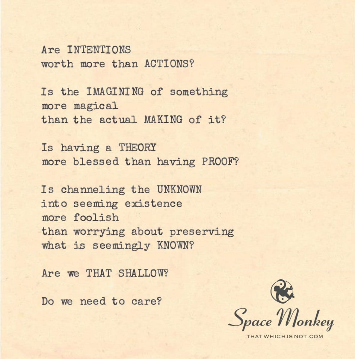 “Are we shallow for imagining more than creating? Or does the shallow simply lead us to the depths of possibility?” — Space Monkey